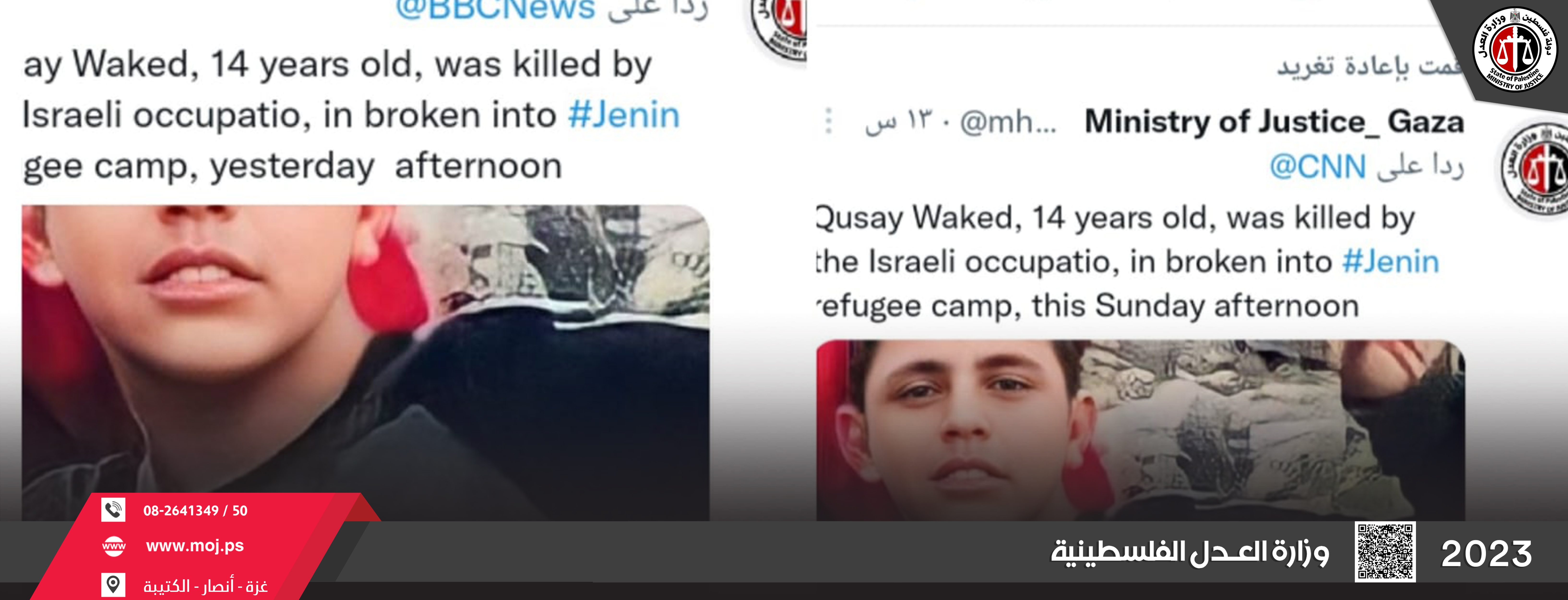 وزارة العدل تغرد باللغة الإنجليزية حول الشهيد الطفل قصي واكد والشهيد الأسير أحمد أبو علي في عدد من الصحف الدولية